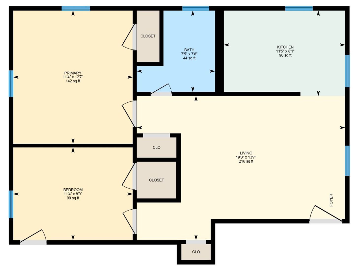 Primary: 12'7" x 11'4" (12.6' x 11.3') | 142 sq ft
